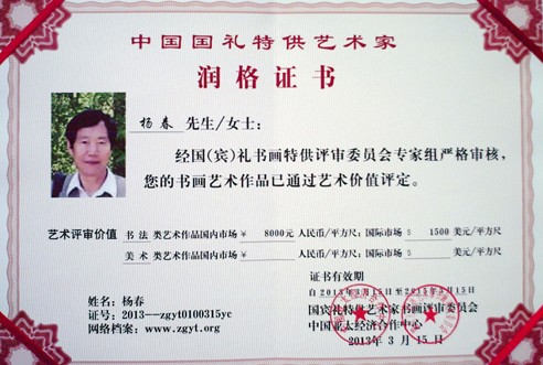杨春(1937.12——),中国国务院国宾礼特供艺术家。徐州第二职业中学高级教师。自幼喜爱音乐书画。现为曹州青年书画院名誉院长,世界当代华裔书画家海联会和香港书画网艺术顾问,香港国际羲之,书画院终身荣誉教授,牡丹书画院签约书画家等。