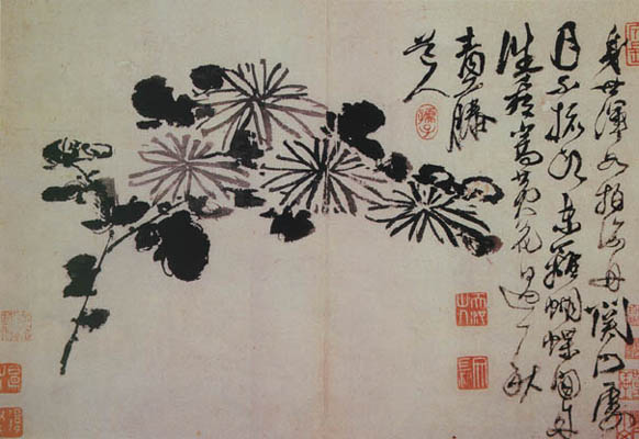 徐渭中年以后开始学画,擅长画花鸟,兼能山水、人物、水墨写意,气势纵横奔放。特长于水墨大写意花卉,工画残菊败荷,炉瓶彝鼎,皆古朴淡雅,别有风致。现藏南京博物院《杂花院》,全画有牡丹、紫薇、葡萄、芭蕉、梅花水仙和竹等13种。情意所至,气势豪放。发挥了高度的艺术技巧。“无法中有法”、“乱而不乱”,表现出画家深厚的功力。在四百年后的今天,仍给人以笔墨淋漓,赏心悦目之感。徐渭所绘山水,纵横不拒绳墨,所绘人物尤其生动。史载“醉后专捡败笔处拟试桐美人, 以笔染两颊,丰姿绝代。转觉世间胭粉如垢尘,不及他妙笔生花。”他的作品不拘于物象,能抓住其神气,用秃笔铺张,势如急风骤雨,纵横脾睨。他的大写意泼墨之势, 继陈道复以后,更加狂纵,笔简意浓,形象生动,影响深远。开启了明清以来水墨写 意法的新途径。清代朱耷、原济、扬州八怪中李(善)、李方膺都受其影响。数百年来势头未衰。