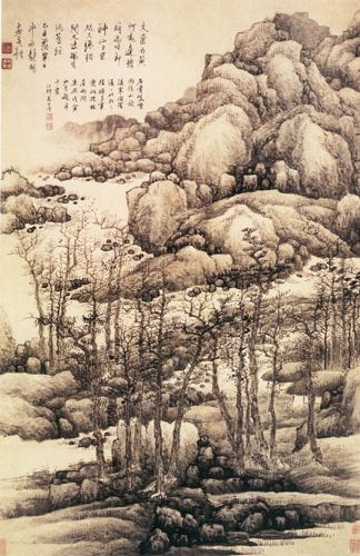 为清初著名山水画家,金陵八家之首。他隐居在清凉山半亩园“栽花种竹,足不履市井”,每天早晨,他看见树叶上的露珠,湿润的树林和中午的树林不同。江南烟雨,六朝的气息,梦幻一样美丽的山峦,长江沿岸的浅滩疏林、孤帆远影,都成了他追求的美好的象征。龚贤的山水画,特淡远苍秀,如不食烟火人长啸千仞之冈,濯足于万里之流;山林氤氲,草林华滋,气韵生动。