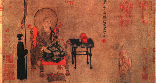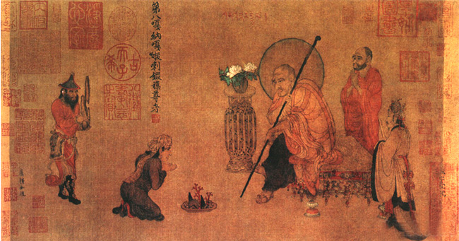 卢棱伽,生卒年不详,唐代画家。棱伽,一作椤伽,长安(今陕西西安)人。吴道子弟子。画风细致,咫尺之间,能画得山水辽阔,形象精备。尤擅佛像、经变,画过许多壁画。宋代赵希鹄说他曾见卢画的《十八罗汉图》,衣纹“真如铁线”,非李公麟所能及。传世作品有《渡水僧图》、《六尊者像》。