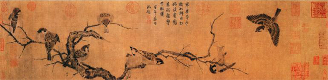 《寒雀图》(崔白 卷 绢本 设色 纵25.5厘米 横101.4厘米 北京故宫博物院藏) 作品描绘隆冬的黄昏,一群麻雀在古木上安牺入寐的景象。作者在构图上把雀群分为三部分:右侧二雀,乍来迟到,处于动态;而中间四雀,作为本幅重心,呼应上下左右,串联气脉,由动至静,使之浑然一体。鸟雀的灵动在向背、俯仰、正侧、伸缩、飞栖、宿鸣中被表现得惟妙惟肖。树干在形骨轻秀的麻雀衬托下,显得格外浑穆恬澹,苍寒野逸。此图树干的用笔落墨都很重,且烘、染、勾、皴,浑然不分,造型纯以墨法,笔踪难寻。虽施以画上的赭石都以褪落,但丝毫未损害它的神采,野逸之趣盈溢于绢素之外,有师法徐熙的用笔特点。