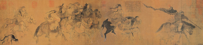 张瑀,生卒不详。为金代画家。本图(指《文姬归汉图》)题款“祗应司张瑀画。祗应司为金代章宗泰和元年(1201)设置,系为宫廷服务的内府机构。他的代表作《文姬归汉图》,绢本,墨笔淡彩。纵29厘米,横129厘米。金代绘画作品传世甚少,所以此图深受历代鉴赏家珍视。文姬归汉的题材,南宋画家陈居中画过。这幅画现藏吉林省博物馆。文姬归汉的历史故事,历来受到人们的重视,常被画家作为重要题材写入画。此图前段画一武士骑老马引路,肩扛圆月旗,顶风而行,一匹小马紧跟着。稍后画文姬戴貂冠,着胡服骑骏马,目视前方,坚定开朗,若有所思。他身后有胡、汉官员一人,胡官面容愁苦,有勒马踟蹰状,再后边有侍从、武士跟随。最后一人驾鹰挈犬,快马追从者。全画用简练而有变化的笔法,画出长途行旅的气氛,人物神态都很真切生动。淡设色,显得古朴苍劲。整个画卷,在运用线描表现物象的神态意志和质感方面,均达到了纯熟的程度。无论是手法、风格,都与唐宋汉族政权下的绘画如出一炉,是一幅人物画的精品。故此画在我国古代绘画艺术品中也是极为罕见的。