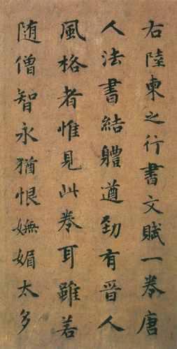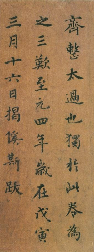 揭傒斯,1274年生,1344年逝世,龙兴富州(今江西丰城)人。元代书家。字曼硕。延祐初授翰林国史院编修,元统初官升至侍讲学士,赠护军,追封豫章郡公,谥文安。故世称“揭文安”。总修辽、金、元三史,著有《文安集》十四卷。工诗文,善书。正、行书师晋人,苍古有力。国家典册及功臣家传赐碑,遇其当笔,往往传诵于人。四方释老氏碑版,购其文若字,袤及殊域。存世书迹有《千字文》、《杂书卷》等。《元史》卷一百八十一有传。《苏轼乐地帖跋》,元揭傒斯书。纸本墨迹。纵25.1厘米,现藏上海博物馆。揭傒斯的楷书、行书、草书俱佳,又善诗,贯通经史百家。为文叙事极为严整,语简而当,与虞集齐名。书法名重当时。此题《苏轼乐地帖》,正文仅3行。无论是作品章法布白方面,还是字的结体和笔划,都含有魏钟繇《荐季直表》的韵味,兼及王献之《洛神赋》13行的某些成份。如笔划的长短、粗细以及体势、欹正变化较大,姿态丰富。笔墨挺拔有力,用笔多不藏锋,结字跌宕而错落有致。行间顾盼有姿,使整幅章法浑然天成,显得分外自由、活泼,妙趣横生,表现了作者意在笔先的刻意匠心。