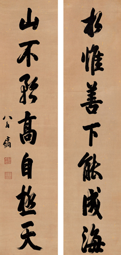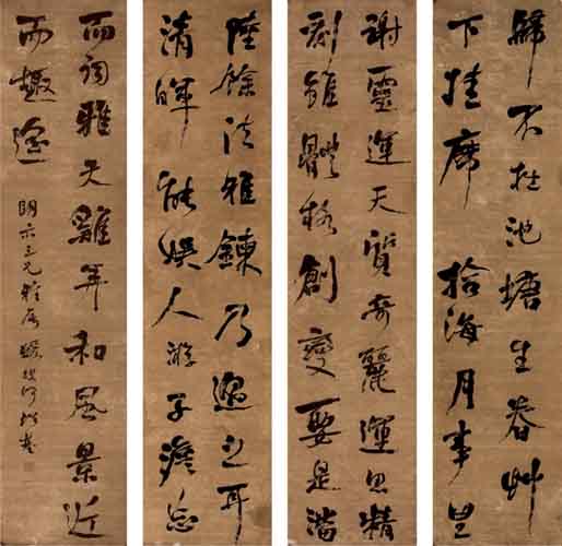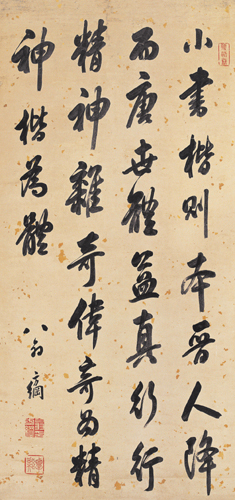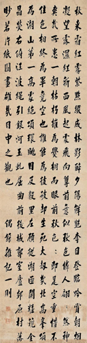 翁方纲,1733年生,1818年逝世,顺天大兴(今属北京市)人。清代书法家。字正三,一字忠叙,号覃溪,晚号苏斋。乾隆进士,官至内阁大学士。长于考证金石,富藏书。对书画、金石、谱录、诗词等艺,靡不精审,其书法尤名震一时。书学欧、虞,谨守法度。尤善隶书,与刘墉、梁同书、王文治齐名,并称:“翁、刘、梁、王”。亦有以其与刘墉、成亲王永瑆、铁保齐名,称“翁刘成铁”。马宗霍《霋岳楼笔谈》称“覃溪以谨守法度,颇为论者所讥;然其小真书工整厚实,大似唐人写经,其朴静之境,亦非石庵所能到也。”著有《两汉石记》、《粤东金石略》、《汉石经残字考》、《石州诗话》等。《苏轼论书跋语轴》纸本墨迹。行书。凡5行,每行字数不一,共108字。纵130.5厘米,横30.8厘米。上海博物馆藏。翁方纲学识广博,对颜书、欧书和唐人写经、汉隶都下过很大的功夫。但他的书法艺术水平并不是很高的。他的书法讲究无一笔无出处,而自己的东西却很少。此行书轴是典型的传统帖学风格。连贯柔和,不急不躁,循规蹈矩,使这幅作品很有特色,不失大家风范。作品中温润丰厚浓墨与纤细的游丝形成强烈的对比。在运笔用墨过程中,由浓渐淡、由粗渐细的过渡缓冲。因此,浓淡、粗细、行止极有节奏感。整幅作品用笔以圆润轻柔为主,没有丝毫方刚急躁的火气,从柔润流畅的笔意中,可推想作者书写时灵活的用腕。综观此作品,运笔沉酣,墨色浓厚,笔划丰满,筋劲骨健,妙得神韵,是他的精品之一。