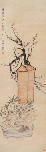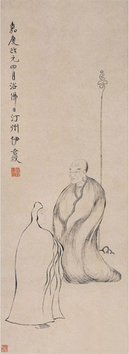 伊秉绶(1754-1815),汀洲(今之福建宁化)人。清代书家。字祖似,号墨卿,晚号默庵。人称“伊汀州”。官惠州、扬州知府,有政声,士民称慕。喜绘画、治印,亦有诗集传世。工书,尤精篆隶,精秀古媚。其书超绝古格,使清季书法,放一异彩。隶书尤放纵飘逸,自成高古博大气象,与邓石如并称大家。蒋宝龄《墨林今话》称其:“以篆隶名当代,劲秀古媚独创一家”。赵光《退庵随笔》称“墨卿遥接汉隶真传,能拓汉隶而大之愈大愈壮。”著有《留春草堂集》。传世书迹甚富。《隶书五言联》,书于嘉庆二十年(1815),纸本墨迹。隶书。凡上下联正文10字,款16字,共26字。纵178厘米,横33.3厘米。首都博物馆藏。伊氏的隶书具有鲜明的个性,笔画平直,分布均匀,四边充实,方严整饬,有强烈的装饰美术之意趣,没有晚期汉隶的“蚕头燕尾”的习气。此隶书联,严格的中锋行笔,藏头护尾,法度森然,其笔画粗细大致均等。圆润率直,分明是地道的篆、籀笔意。结体左右平均匀称。他的隶书,善用浓墨,墨色柔润,乌亮如漆,笔划光洁精到,此五言联,其笔力雄健,中画沉厚挺拔,融合了《郙阁颂》、《张迁碑》、《衡方碑》等汉隶名碑的优点,形成了自己严而不刻板,凝重而有韵致,夸张而合情理的隶书风格。