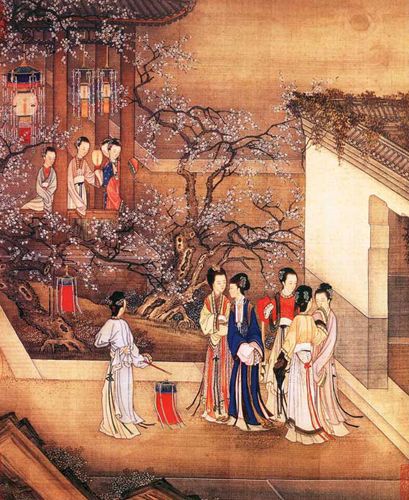 陈枚,清代。字载东,号殿抡,晚号枝窝头陀,娄县(今上海市松江)人。画初学宋人,折衷于唐寅,参以西洋法,能于寸纸尺缣,图群山万壑,以显微镜照之,峰峦林木,屋宇桥梁,往来人物,色色俱备,其用笔之妙,与巨幅同。雍正四年(1726)以供奉内廷劳,赏内务府掌义司员外郎衔。乾隆元年(1736)与孙祜等同绘清明上河图,乾隆七年(1742)尝作鸦飞马健图。