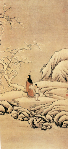萧晨(1658-约卒于康熙中叶),清代。字中素,号灵曦,扬州人,共诗,亦善画工笔山水、人物,江苏扬州人。山水、人物,师法唐、宋,画雪推名手。善诗赋,隐梓人中,人以工役之,往役受直,待以诗人,则行朋友之礼。其人物设色妍雅,衣纹清劲流走,惟点置眉眼,未能清逸雅秀。康熙十三年(一六七四)作杜少陵(甫)诗意图,三十六年(一六九七)作枫林停车图,均藏故宫博物院。