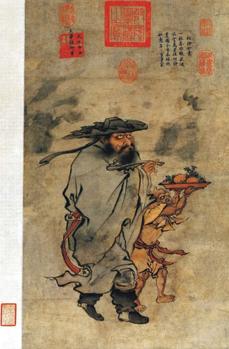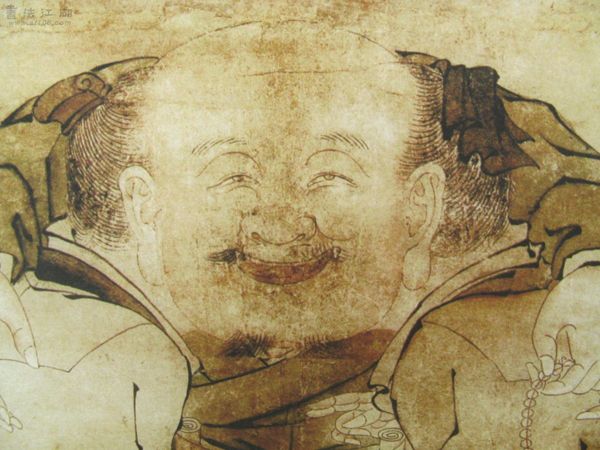 朱见深 (1448-1487),明代。宪宗皇帝,英宗长子,宣宗孙,在位二十三年。工书画,尝为张三丰写像,神采生动,超然尘表。《珊瑚网》载有宪宗山水小景。尝画《一团和气图》,取虎丘三笑故事,将陶渊明、陆修静、惠远法师三人合为一体,构思独特而巧妙。自赞曰:“伟者达人,遐观高视,谈笑有仪,俯仰不愧,合三人以为一,达一心之无二,忘彼此之是非,蔼一团之和气。噫!和以召和,明良其类,以此同事事必成,以此建功功必备。岂无斯人,辅予盛治。披图以观,有概予志。聊援笔以写怀,庶以警俗而励世。”此图运用滑稽形象来警俗励世,堪称我国存世最早之漫画,另有《岁朝佳兆图》轴,两画均藏故宫博物院。