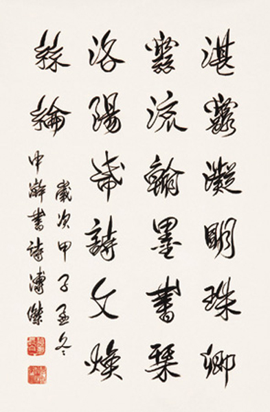 溥杰自幼受到严格的书法基础训练,工行书,初学虞世南,后受其业师赵世骏影响而自成一体,所作隽秀爽健,婀娜多姿。生前为中国书法家协会名誉理事,全国人大民族委员会副主任委员。